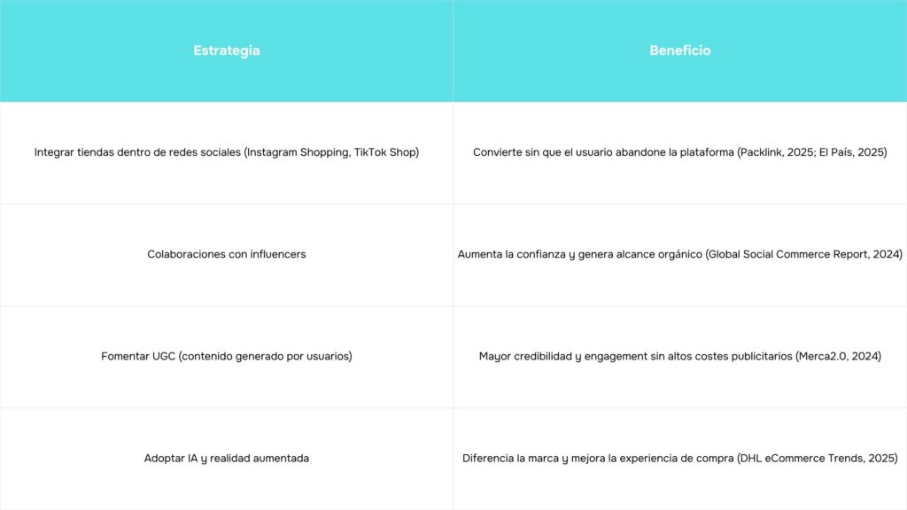Compra sin fricción: funcionalidades como Instagram Shopping o TikTok Shop permiten adquirir productos sin salir de la app (Packlink, 2025).